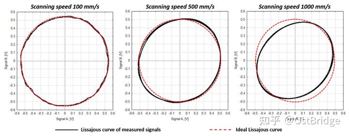 Firstly, we checked the performance of the test line encoder at different speeds, and the encoder supplier specified a maximum traversal speed of 100500, and 1000mm/s. Figure 5 shows the Lissajous curves for several signal cycles at 100, 500, and 1000 mm/s.